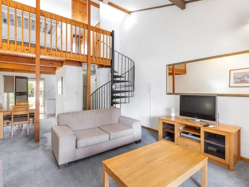 The home offers a functional layout, beginning with a fully equipped kitchen and an open plan lounge and dining area that flows to a private balcony. Bedrooms are located on a mezzanine level, accessed via a charming spiral staircase, featuring a loft style double bedroom. The bathroom is conveniently positioned on the ground floor.