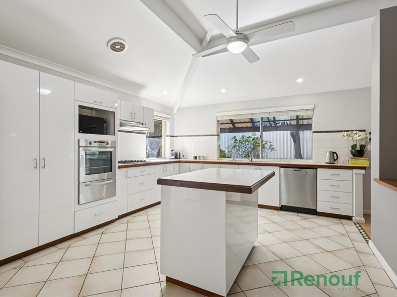 Bright and airy, the home features large living, family, and dining areas, while the north-facing undercover alfresco flows seamlessly outdoors, perfect for family gatherings, weekend barbecues, or quiet mornings with a coffee. The generously appointed kitchen is ideal for casual dining or entertaining, with high-end appliances, abundant preparation space, and ample storage.